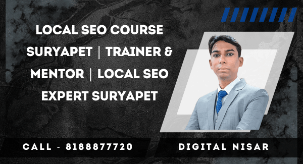Local SEO Course in Suryapet by Best Local SEO Mentor Digital Nisar is designed for those who want to master the skill of ranking on Google Maps and increasing local business visibility. Learn from an experienced Local SEO Trainer in Suryapet and become a certified Local SEO Expert. Whether you are a student, freelancer, or business owner, our Local SEO Training in Suryapet will help you grow your online presence with real-world strategies.